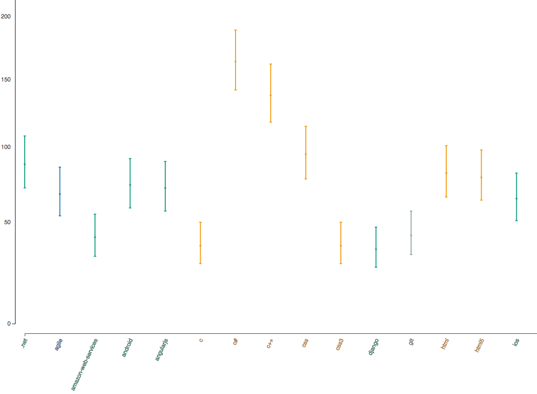 My awesome colleagues Tomas and Igor were kind enough to whip up [this simple interactive chart](https://www.javascripting.com/assets/s3/blog/stack-overflow/stack-overflow-careers.html" target="_blank) using D3. You can see the occurrence values for each tag with confidence intervals. Use the checkboxes to choose which categories you want to view (assuming you don't hate the way I classified them). Use the slider to filter the results to a specific range of occurrences (e.g. only tags with more than 100 occurrences). You can also zoom into a specific section of the chart by selecting it with the mouse. Fun, isn't it?